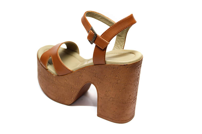 MATERIAL: Sandalia 100 % cuero caramelo con hebilla, Forra de badana, Plantilla forrada de badana, Plantilla pre fabricada, Planta PU varesina, Taco 70 con plataforma, Talla 35 a 39