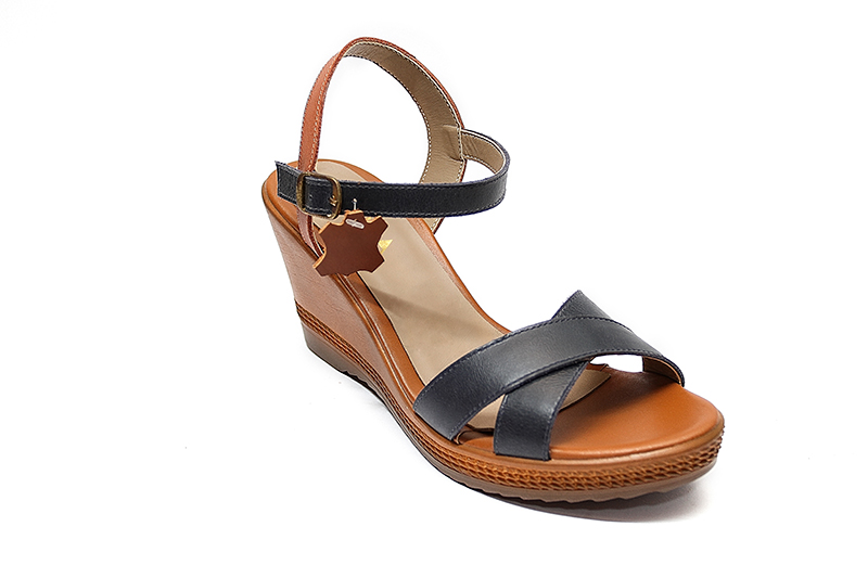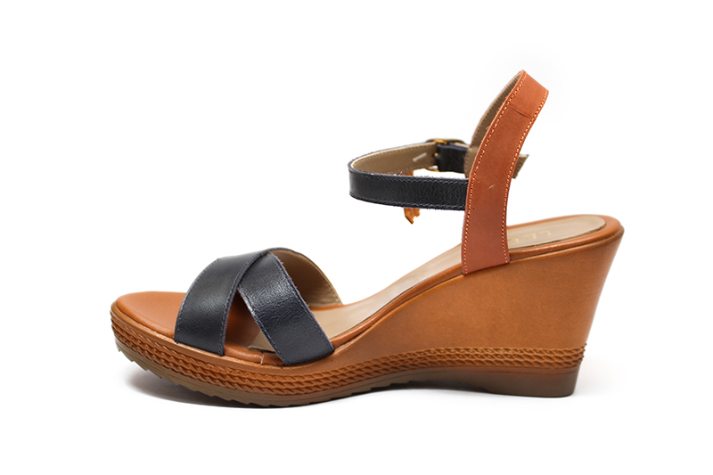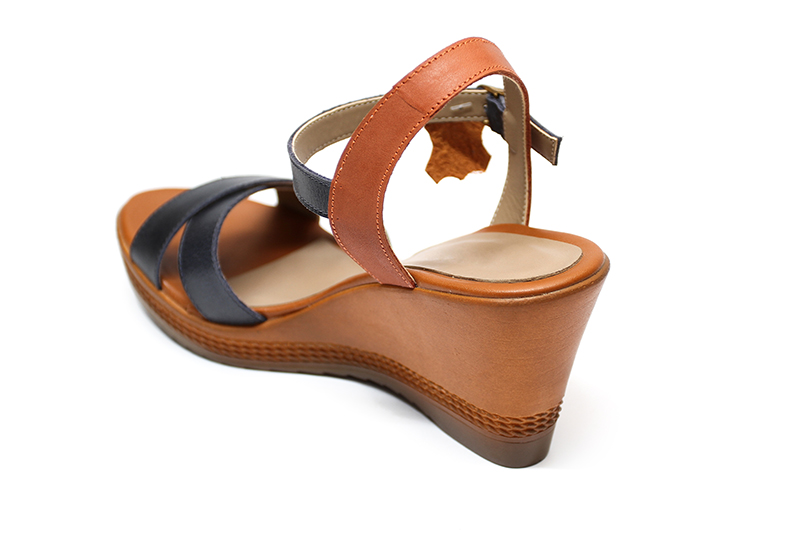 MATERIAL: Sandalia 100% cuero color cobre con azul, hebilla con forro badana, Forro de falsa de cuero, Plantilla badana falsa pre fabricada, Taco cuña 70, Talla 35 a 39