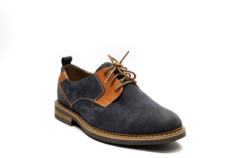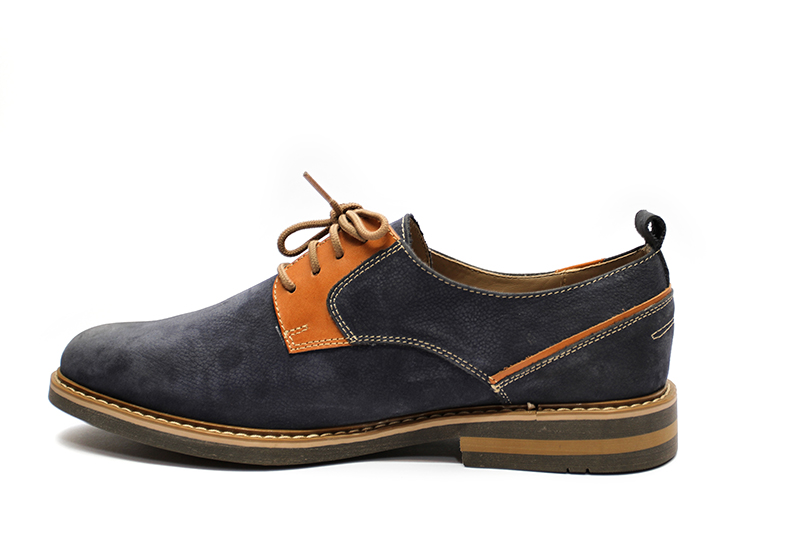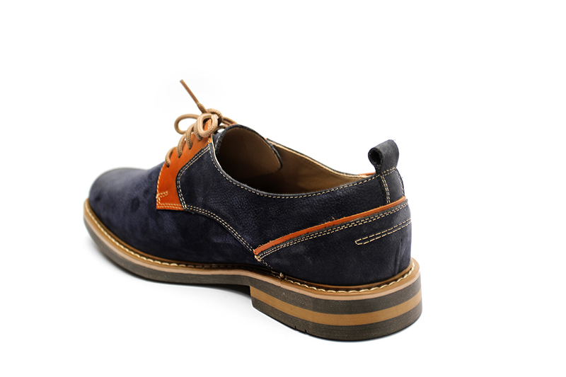 MATERIAL: Calzado 100 % Cuero granulado azul con camel, Badana beige, Forro badana, Planta TR, Pasador cola de rata enserado, Plantilla acolchada látex