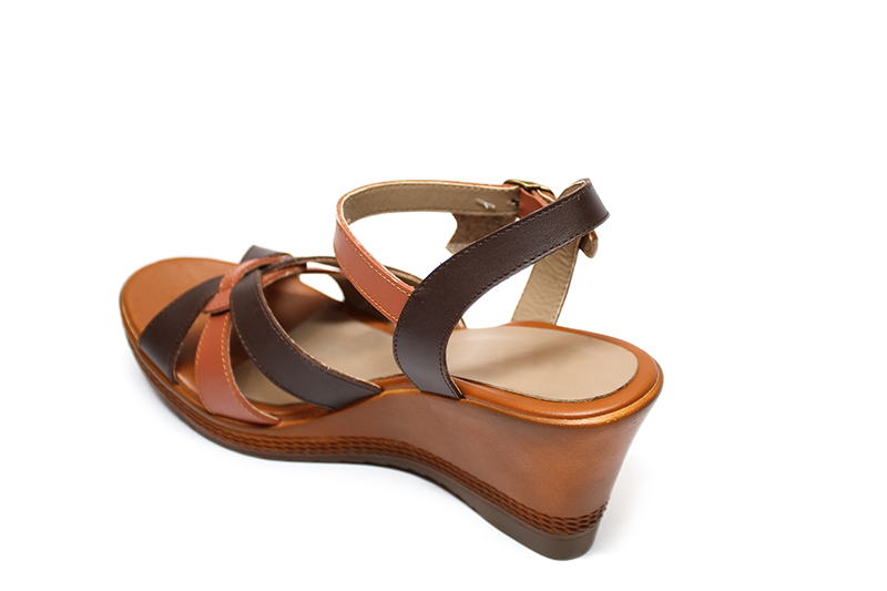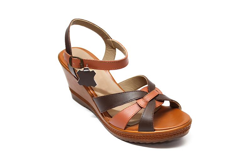 MATERIAL: Sandalia 100 % cuero marrón con cobre, Hebilla, Forro badana, Plantilla de badana, Forro de la falsa de cuero falsa pre fabricada, Planta PU taco 70 en cuña, Talla 35 a 39