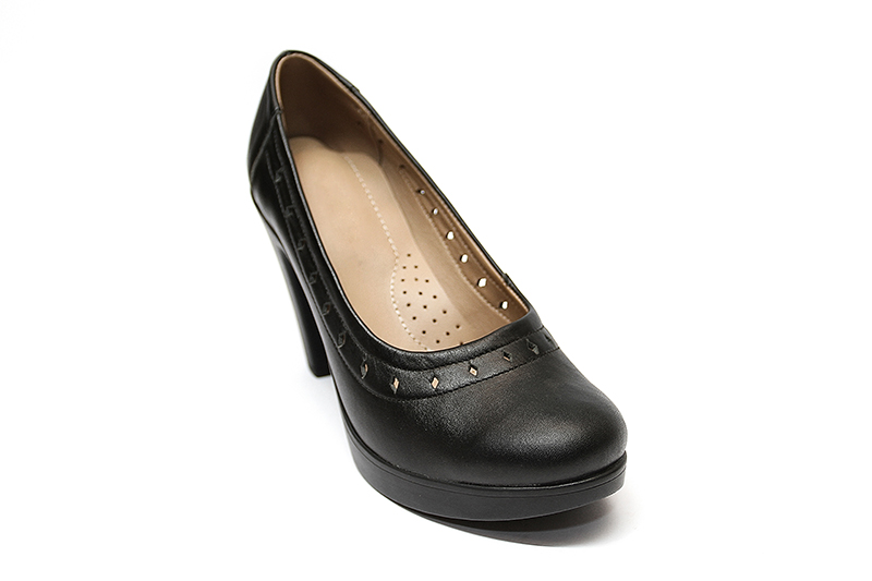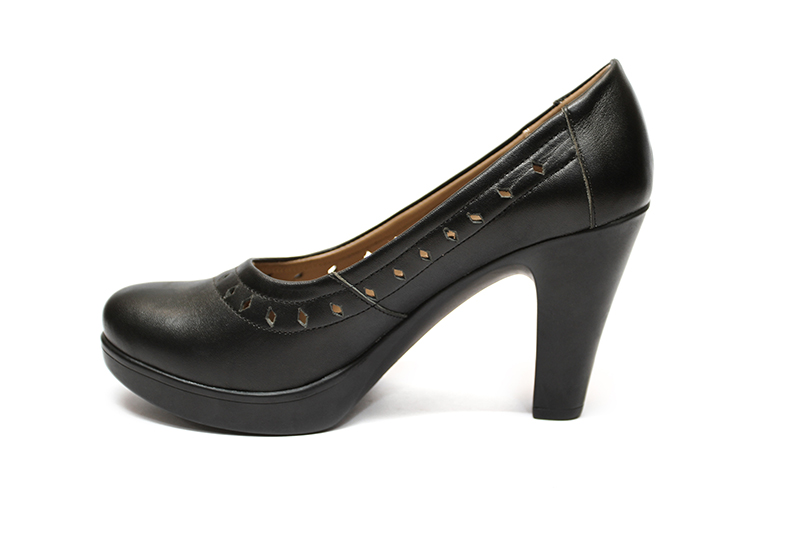 MATERIAL: Zapato 100 % cuero color negro con picado, Forro badana, Puntera y contrafuerte de inversión, Plantilla de badana acolchado, Falsa pre fabricada, Panto taco 90 con plataforma, Planta PV, Talla 35 a 39